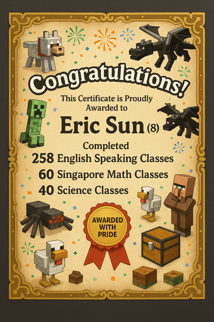 - Themed to his world: Instead of a generic “Certificate of Completion,” he received something like “Minecraft Master Builder Award.” That instantly connected with him.