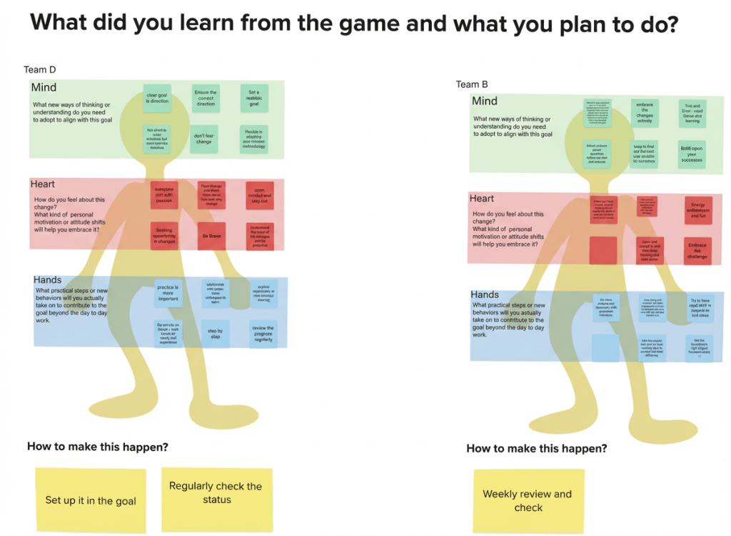 To ensure the powerful learnings from the game were not lost, I used the “Mind, Heart, Hands” framework as a bridge between the experience and their work. I designed this reflective exercise to guide participants in processing what they had just learned and applying it directly to their roles by asking them to define: