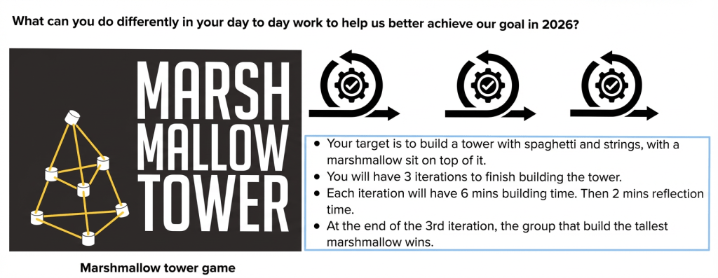 I strategically engineered the “Aha!” moment of the workshop. I introduced the Marshmallow Tower game after the goal clarification session. This timing was intentional, as it transformed the game from a simple icebreaker into a powerful, hands-on metaphor for the mindsets I wanted to cultivate. By facilitate a rapid cycles of building, testing, and learning, the participants organically discover critical lessons in a low-stakes environment: